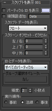 - : 次の値を使用して、パーティクル位置に対して相対的なスクリプト データの配置をピクセル単位で調整します。次の値を使用して、パーティクル位置に対して相対的なスクリプト データの配置をピクセル単位で調整します(位置、速度、スケールなど)を同時に表示できます。