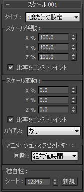 [スケール](Scale)オペレータの既定値によってスケール係数はすべて同じ値に制限されているため、パーティクルは均等にスケールされますが、[トラック ビュー](Track View)内でコントローラを変更した場合はパラメータ単位で動作します。