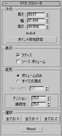 このロールアウトを使用すると、ラティスのサイズ、解像度、表示方法、および変形方法の設定ができます。