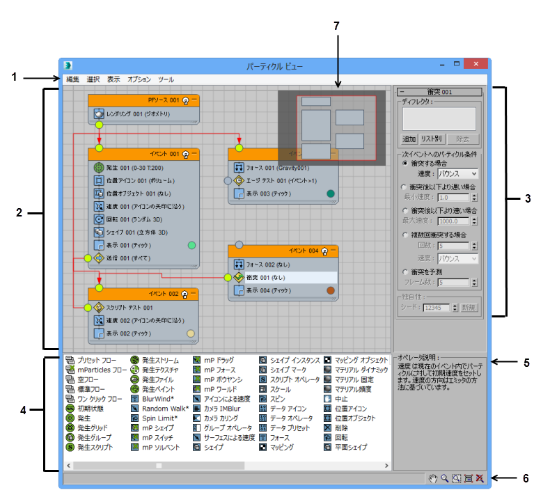 パーティクル ビューは、パーティクル フローでパーティクル システムを作成および修正するための主なユーザ インタフェースを提供しています。メイン ウィンドウは「イベント表示」と呼ばれ、パーティクル システムについて記述した「パーティクル図」が表示されます。パーティクル システムは、相互にワイヤリングされた 1 つ以上のイベントで構成されており、各イベントには、1 つ以上の オペレータ と テスト のリストが含まれています。オペレータとテストは、まとめて「アクション」と呼ばれます。