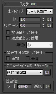 - [出力タイプ](Output Type)が[ワールド単位](World Unit)の場合は、どちらかのオプションを選択することにより、パーティクル フローで、フレーム、秒、またはティックあたりの単位でスカラー データが加速度または速度として使用されるようにすることができます。[加速値として使用](Use As Acceleration Value)と[速度値として使用](Use As Speed Value)は一方だけをオンにでき、両方をオンにすることはできません。オプションをもう一度クリックするとオフになります。