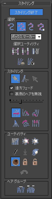 スタイリング ツールは、[ヘアをスタイル](Style Hair)をクリックしてオンにするか、[選択](Selection)ロールアウトまたはモディファイヤ スタックのいずれかで[ガイド](Guides)サブオブジェクト レベルを選択しないと、使用可能になりません。