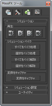 [シミュレーション](Simulation)サブメニューの[シミュレーションを再生](Play Simulation)、および MassFX ツールバーの