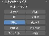 ([ジオメトリ](Geometry))をアクティブにし、[オブジェクト タイプ](Object Type)ロールアウトで[円柱](Cylinder)をクリックしてアクティブにします。また、[オート グリッド](AutoGrid)チェック ボックスをオンにします。