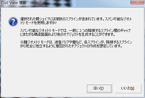 このダイアログ ボックスが表示されるのは、シェイプ オブジェクトに複数のスプラインが含まれているためです。このような場合、スイープ オブジェクト スタイル エディタでは、2 つのうちの 1 つの方法で各スプラインの目的を解釈することができます。橋梁路面やトンネル ライニングなどのオブジェクトを生成する場合は、[スパン可能なジオメトリ モード](Spannable Geometry Mode)が適しています。このモードでは、各スプラインが道路の片側を表していると仮定して、スパン サーフェスと閉結サーフェスでスプライン間のギャップにまたがる「リンク」サーフェスを生成することができます。一方、[分離ジオメトリ モード](Separated Geometry Mode)は、遮音バリアや擁壁の作成により適しています。このような形状においてこのモードでは、スイープ オブジェクトのジオメトリがシェイプの各スプラインに対して個別に適用されます。