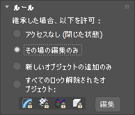 既に説明したとおり、コンテナ内にあるオブジェクトの特定のトラックがロックされていても、[その場の編集のみ](Only Edit In Place)ルールを使用すると、継承したユーザはそのロックを簡単に解除できます。ただし、異なるルールを使用すれば、作成者がルールを変更しない限り、継承したユーザは作成者のロックに従わなければなりません。