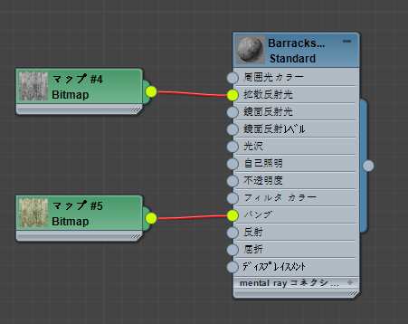 - 新しいビットマップ ノードから BarracksRoof マテリアルの[拡散反射光カラー](Diffuse Color)コンポーネントにワイヤリングします。