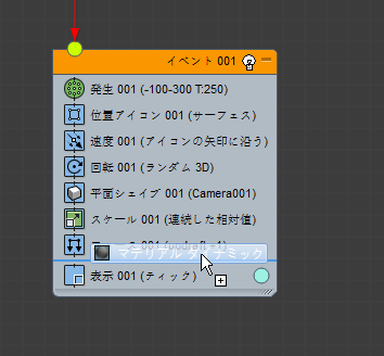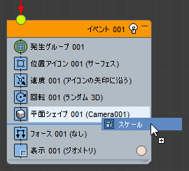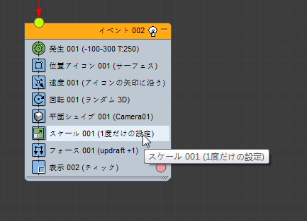 - Scale オペレータをコンテナから Event 01 にドラッグし、Shape Facing オペレータと Force オペレータの間にドロップします。