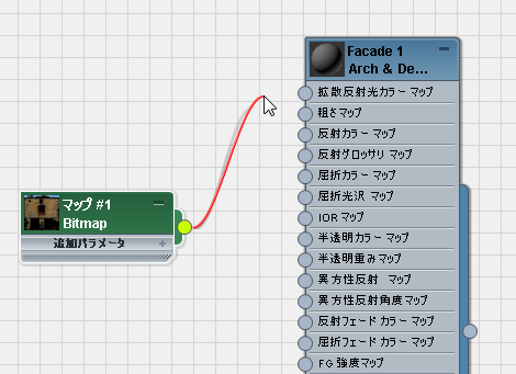 - ビットマップ ノードの出力ソケット(右の小さな円)からドラッグします。ビューにワイヤが表示されます。ワイヤの終端を、Arch & Desin マテリアルの[拡散反射光カラー](Diffuse Color)入力ソケット(左の小さな円)にドロップします。