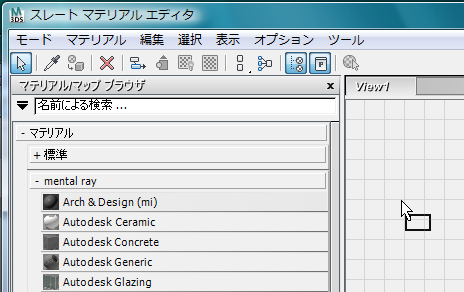 [menta ray]を探し、[Arch & Design]エントリをアクティブなビュー(エディタ中央にある View1 と表示された大きなパネル)にドラッグします。