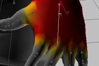 これは、アニメーションや、頂点の位置によって違ってきます。この作業の目的は、指を曲げたときに面がつぶれて歪んでしまうのを防ぐことです。最終的には、次の図のようになるまで調整してください。