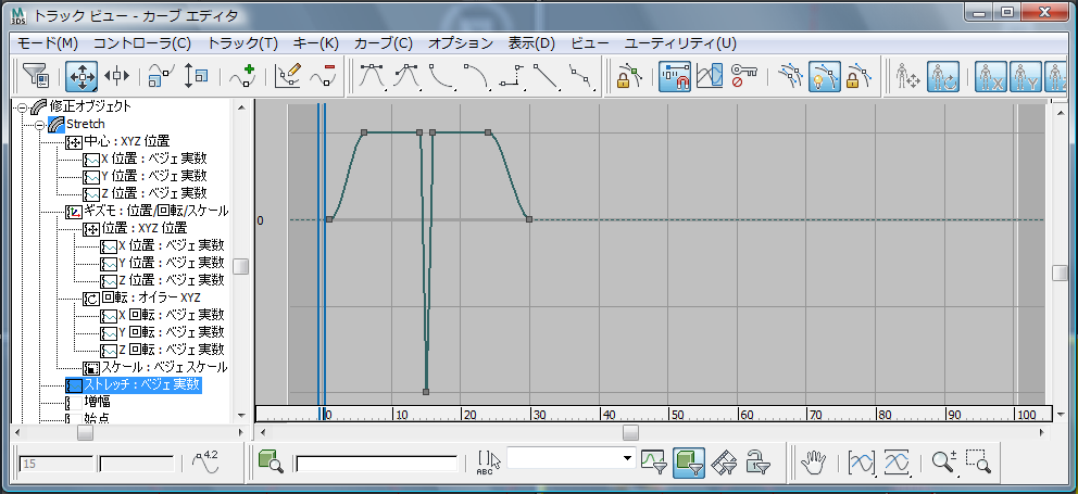 [Stretch : ベジェ 実数](Stretch : Bezier Float)のようになります。この演習では使用していない位置、回転、スケールのトラックの下にあるので、下にスクロールする必要があります。