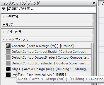 ヒント: スレート マテリアル エディタ内を簡単に移動するには、ウィンドウを既定値のサイズよりも大きくします。ウィンドウを大きくすると、[マテリアル/マップ ブラウザ](Material/Map Browser)パネルをドラッグして幅を広くすることもできます。