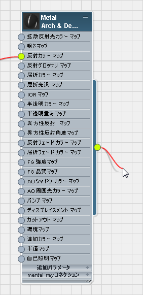 - 今回は、Metal マテリアル ノードの出力ソケット(右の丸いコントロール)からドラッグします。