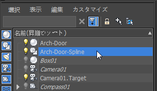 - H を押し、[オブジェクトを選択](Pick Object)ダイアログ ボックスでリストから Arch-Door-Spline を選択し、[選択](Pick)をクリックします。