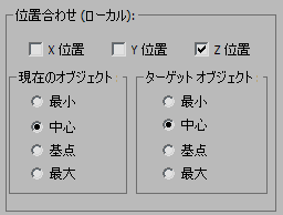 [位置合わせ (ローカル)](Align Position (Local))領域で、[X 位置](X Position)と[Y 位置](Y Position)をオフにして[Z 位置](Z Position)をオンにし、現在のオブジェクトとターゲット オブジェクトの両方のサブグループで[中心](Center)を選択します。[OK]をクリックします。