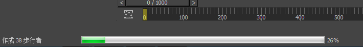 しばらくの間計算が行われた後、Populate によって、アニメートされたキャラクタがプレースホルダの場所に配置されます。シミュレーションの作成中は、3ds Max ウィンドウの下部にあるステータス ライン領域に進行状況バーが表示されます。