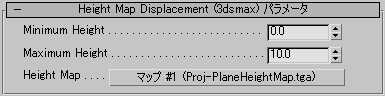 - Height Map Displacement ノードをダブルクリックしてパラメータを表示し、[Height Map Displacement]ロールアウトで[Minimum Height]を 0.0 に設定します。