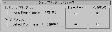 - [シェル マテリアル パラメータ](Shell Material Parameters)ロールアウトで、[ベイク処理済みマテリアル](Baked Material)をレンダリング出力で可視になるよう設定します。
