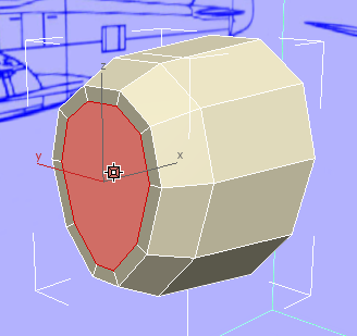 この時点で、飛行機の前面はほぼ完成しています。ただし、3ds Max での、このモデルの元になっている円筒を構築した方法が原因で、エアインテークの面が 10 辺のポリゴンになっています。前述のとおり、一貫した四角形のポリゴンで構成されたメッシュを使用することをお勧めします。このようなメッシュを使用すると、スムージングやスキンの変形(キャラクタを作成する場合)を行うときにはるかに作業がしやすくなります。そこで、大きな 10 辺のポリゴンを小さな四角形のポリゴンに分割して、エアインテークを完成させます。