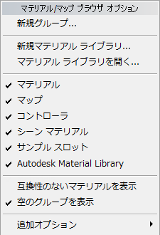 ([マテリアル/マップ ブラウザ オプション](Material/Map Browser Options))をクリックし(またはダイアログ ボックスの何もない領域を右クリックして)、ポップアップ メニューから[マテリアル ライブラリを開く](Open Material Library)を選択します。