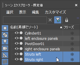 - シーン エクスプローラで[Ctrl]キーを押しながら、[支柱](Struts)オブジェクトをクリックして選択します。シーン エクスプローラが開いてない場合は、メイン ツールバーで