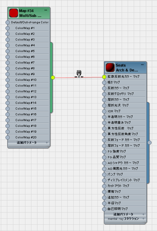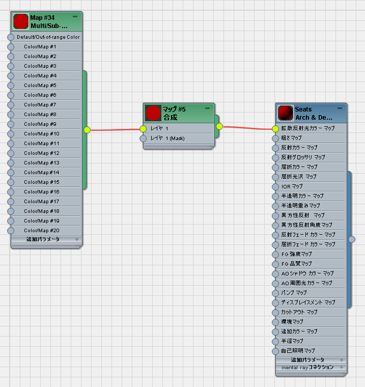 [合成](Composite))をド ッグします。アクティブ ビューで、マルチ/サブ マップと seats マテリアルをつなぐワイヤ上にマップをドロップします。 3ds Max によって、マップをワイヤに挿入していることを示すカーソルが表示されます。このカーソルが表示されたらマウスを放します。