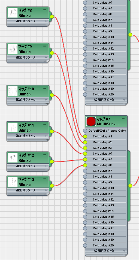 - 新しいビットマップ ノードから新しいマルチ/サブ マップの[Color/Map #1]コンポーネントにワイヤリングします。