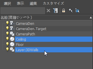 - [シーン エクスプローラ](Scene Explorer)パネルで、Ctrl+クリックで壁と天井のオブジェクトを選択します。