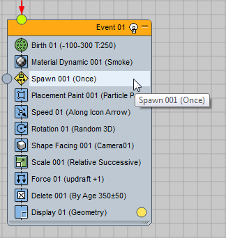 煙のパーティクルの数を増やす方法の 1 つは、Birth オペレータの[量](Amount)の値を増やすことです。しかし、このレッスンでは、Spawn テストを使用してパーティクルの数を調整します。これは実用的な代替技法です。また、[スポーン](Spawn)を使用すると、次のレッスンの残り火の作成でも役立ちます。