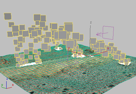 これで、パーティクル フローは、パーティクル生成のジオメトリのソースとして Particle Paint ヘルパーを使用するようになりました。