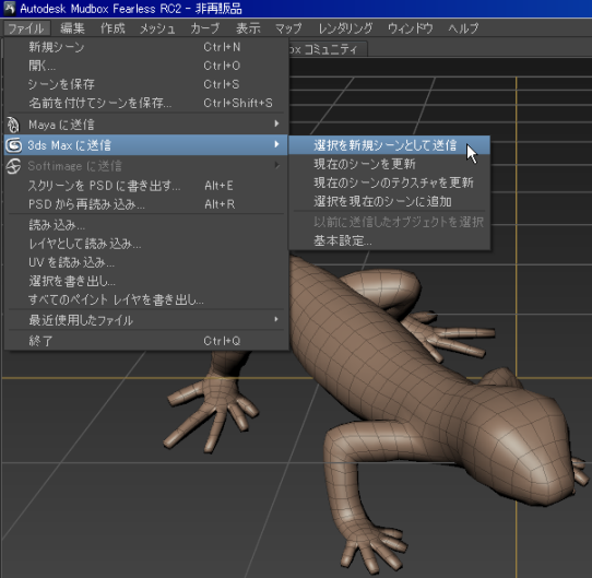 Mudbox から 3ds Max が起動されます。しばらくすると、トカゲのモデルがビューポートに表示されます。既に選択されています。
