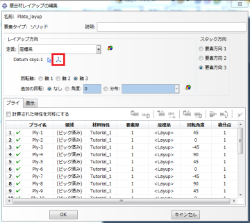 - Ply-1 の[Rotation Angle]エントリをクリックします。これにより Ply-1 の方向は、ビューポートのプレートを基準として表示されます。Ply-1 が下図に示すような方向であることを確認します。