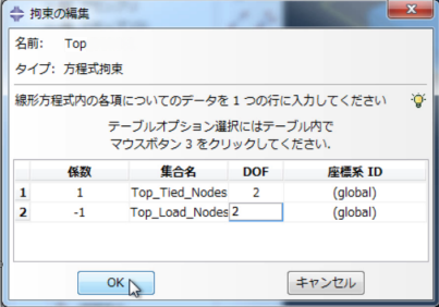荷重節点に関連付けられている節点の Y 方向の変位を拘束するには、[Constraint] > [Create]を選択し、[Equation]タイプを選択します。この拘束に Top という名前を付けます。[Fill out the Edit Constraint]ダイアログ ボックスは、次のように表示されます。