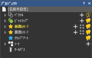 デフォルトで、プロジェクト ツリーの ベクトル、ビットマップ、前面レリーフ、裏面レリーフ には、それぞれの基本レイヤーがあります。ベクトル、ビットマップ、レリーフは、対応するレイヤーに作成されます。複数のレイヤーを作成して、個別のベクトル、ビットマップ、レリーフをグループにまとめ、2D デザインと 3D デザインを効果的に整理することができます。