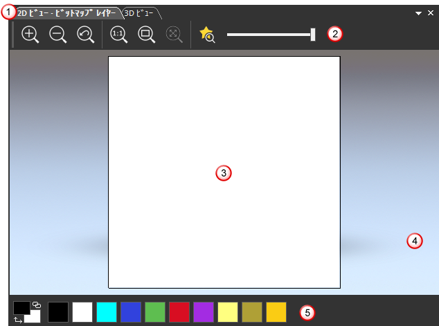 2D ビュー タブには、ビューの名前とアクティブなビットマップ レイヤーの名前が表示されます。 |