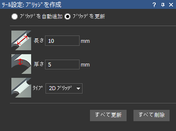 - ブリッジの厚さを変更する場合、ツール設定: ブリッジを作成 パネル、選択ブリッジ セクションの 厚さ に新規値を入力して 適用 をクリックします。