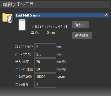 - 選択した工具のセクションを展開して、工具の加工パラメーターを表示します。