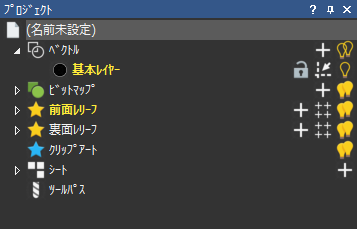 プロジェクト パネルのプロジェクト ツリーで、ベクトル レイヤー層に含まれているベクトル レイヤーを 1 つ、または、複数選択すると、分割バーの下に、そのベクトル レイヤーのパネルが表示されます。パネルには、次の設定があります。