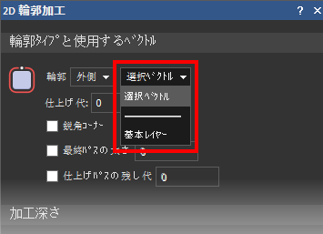 輪郭加工のタイプと使用するベクトル セクションでは、ベクトル アートワークの加工タイプ、ツールパスを適用するベクトル、仕上げ代、最終パスの厚さ、仕上げパスの残し代などを指定します。