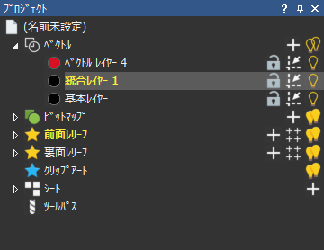 統合したベクトル レイヤーには、順に番号が付きます。(例: 統合レイヤー 1) 統合元の可視のベクトル レイヤーは、ベクトル レイヤー層に残ります。ただし、これらのベクトル レイヤーの内容は空になり、ベクトル レイヤー自体も非表示(不可視)に設定されます。