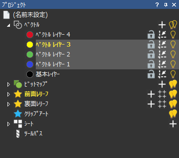 を使用して、プロジェクト ツリーのベクトル レイヤー層のすべての可視のレイヤー、または、ベクトル レイヤー層で選択したレイヤーを 1 つのベクトル レイヤーにまとめます。これにより、ArtCAM モデルのメモリー容量を減らすこともできます。ただし、統合したレイヤーは 1 つのレイヤーと認識されるため、レイヤーを個別に編集することはできなくなります。