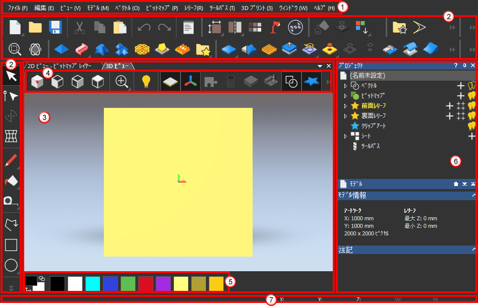 ワークスペース領域には、2D ビューと 3D ビューがデフォルトのタブ形式で表示されます。ベクトル アートワークとビットマップ アートワークは、どちらのビューにも表示されます。レリーフ、生成したツールパス、ツールパスのシミュレーションは、3D ビューにしか表示されません。 |