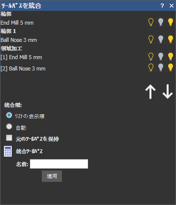 - 統合順 セクションで、統合したツールパスの加工順序を指定します。
