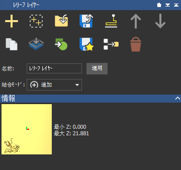 3D ビューでレリーフ レイヤーが非表示(不可視)に設定されていても、このパネルには、そのレリーフ レイヤーのサムネイルが表示されます。サムネイルによるレイヤー内容の確認は、多数のレリーフ レイヤーから合成レリーフが構成されている場合に有用です。 パネルにサムネイルが表示されていない場合、情報 セクションをクリックして展開します。