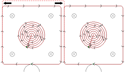 注: オフセット距離は、正と負の、どちらの値にも指定可能です。選択したツールパスの右上に向かって配列コピーする場合、オフセット距離を正の値にします。選択したツールパスの左下に向かって配列コピーする場合、オフセット距離を負の値にします。