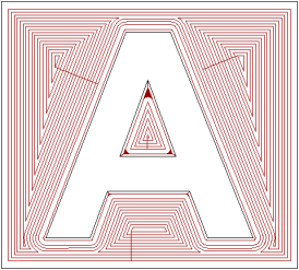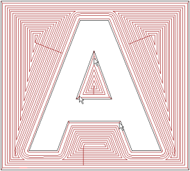 次の例のベクトル テキスト 「A」 では、輪郭のみ オプションの使用により、パスの数が少なくなっている(特に中央のキャビティ部)ことが分かります。