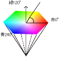 色相は、人間が色を識別するために使用する質です。たとえば、赤、緑、黄は色相です。HSL の 2 つの六角錘では、色相は縦軸の角度によって計測されます。赤は 0 度、緑は 120 度、青は 240 度です。