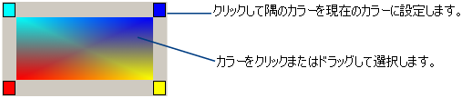 Blend ボックスは 4 つのカラーのブレンドを表現します(パレットの四コーナーにある四角形のカラー)。Blend ボックスでは、ボックスの任意の場所をクリックまたはドラッグしてカラーを選択できます。