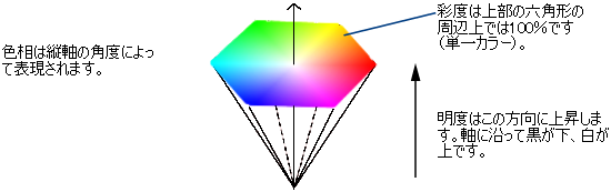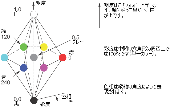 HSL カラー モデルでは、アーティストにわかりやすい次元を使用して、カラー(色相、明度、彩度)を指定します。これらの 3 つの次元は 2 つの六角角錘で表現されます。